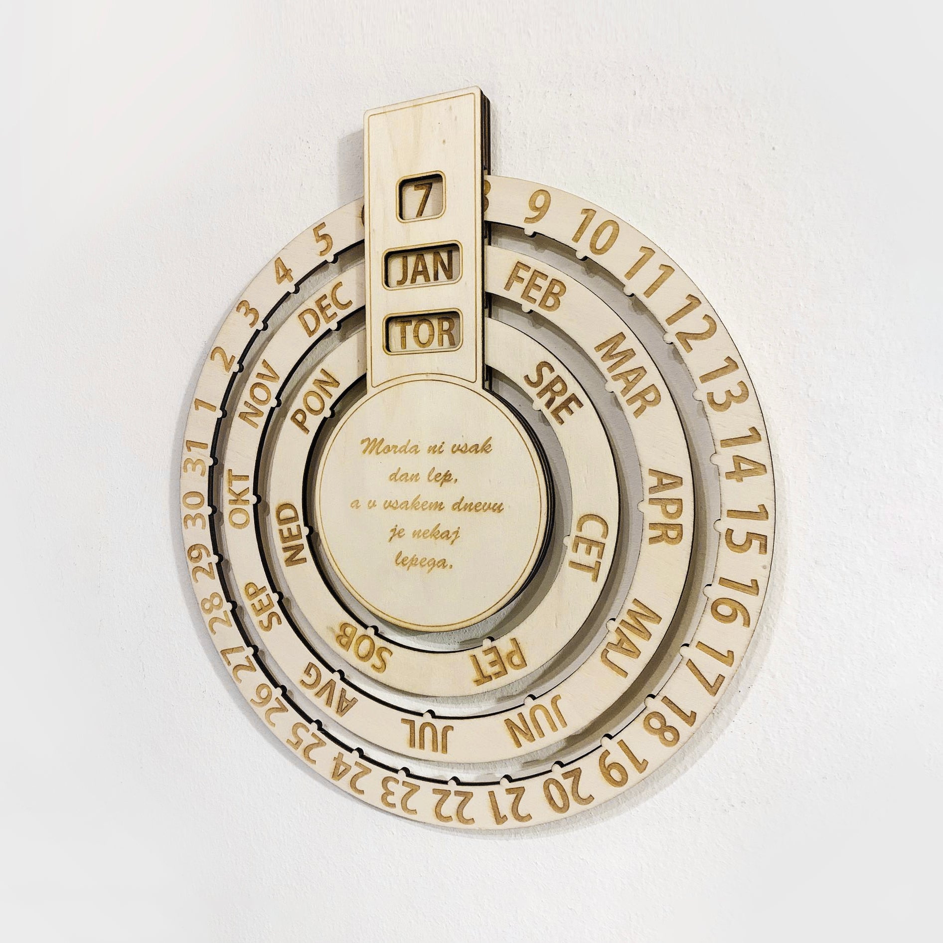 Čudovito darilo za rojstni dan. Lesen koledar z enostavno nastavljivim datumom ter dnevom v tednu. Možne so različne gravure v sredinskem delu, po vaši želji.