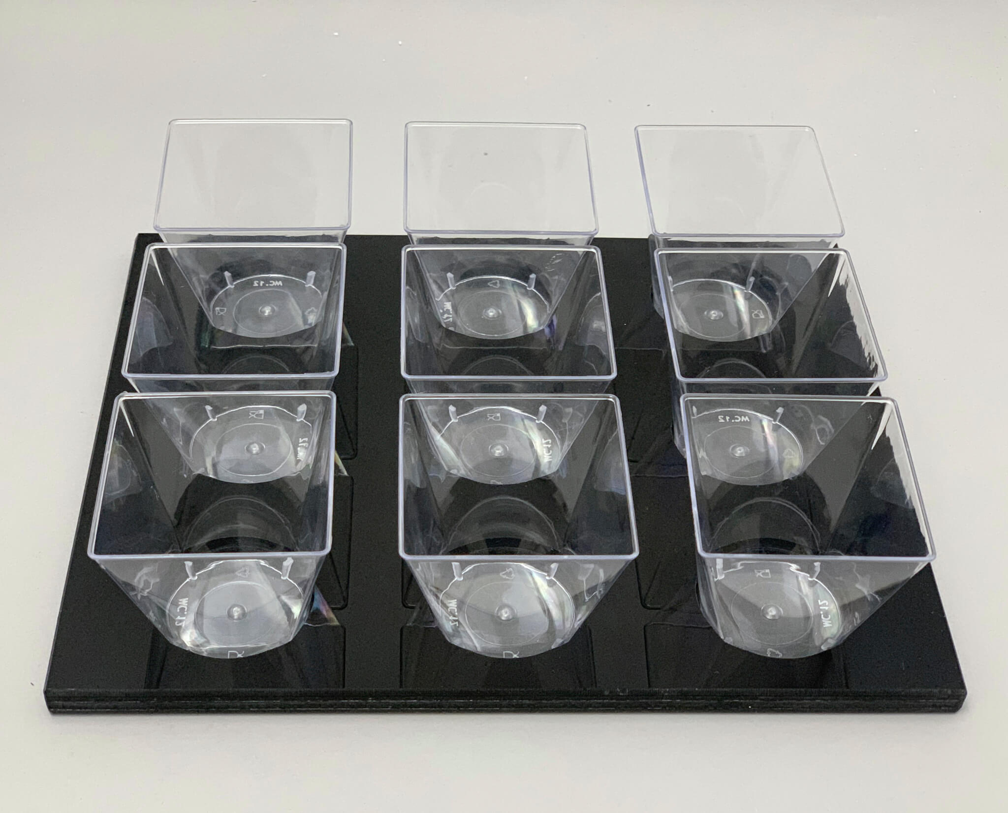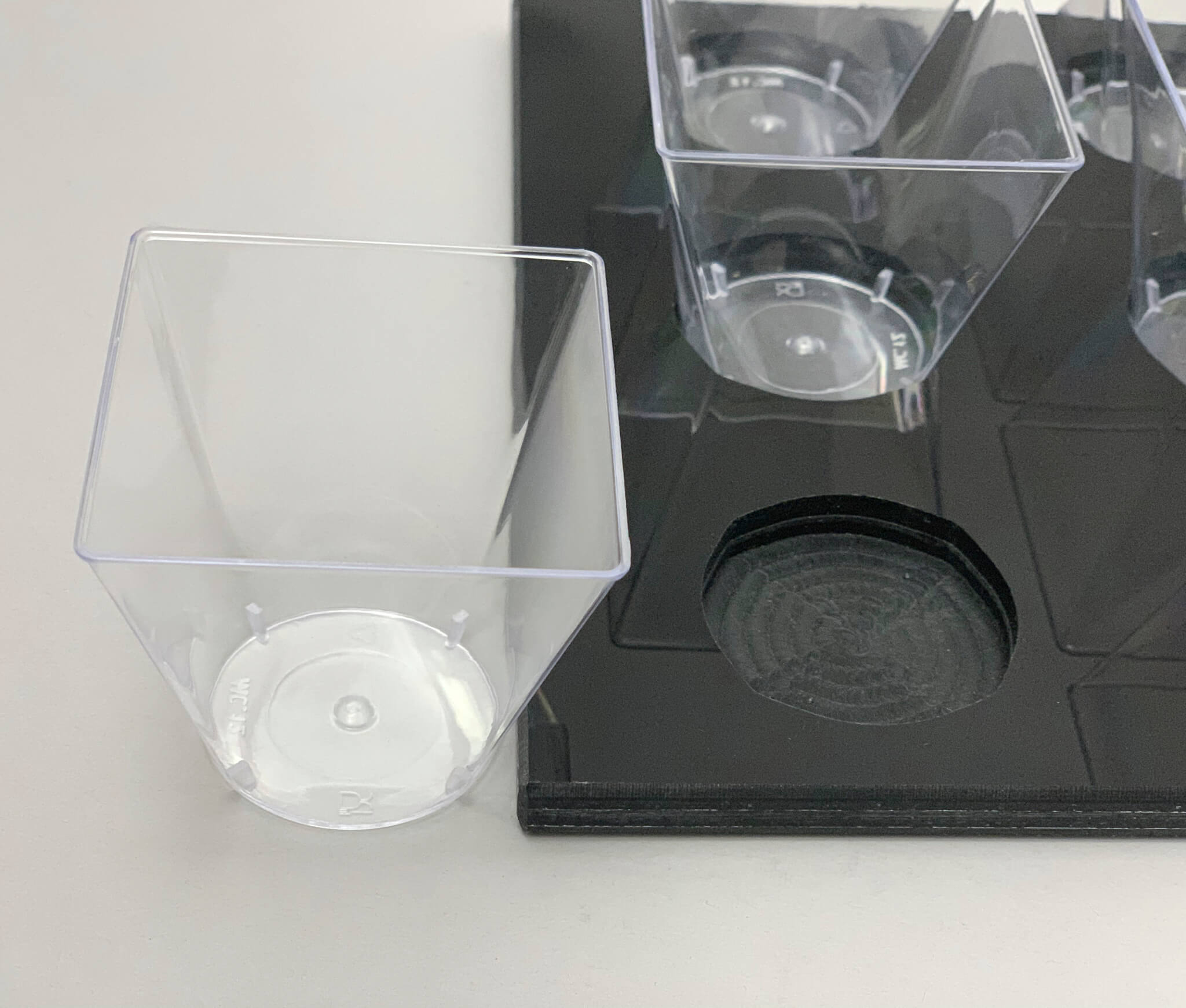 Pladenj za sladice v kozarcu je izdelan tako, da se lonček točno prilega v odprtino, namenjeno za odlaganje. S tem se prepreči ponesrečen zdrs s pladnja, predvsem med strežbo gostom. Z vstavljanjem lončkov v odprtine nimamo nobenega dodatnega dela s poravnavanjem posodic, ker so odprtine že v točni liniji. Odprtina je univerzalna za kvadratne ali okrogle lončke.