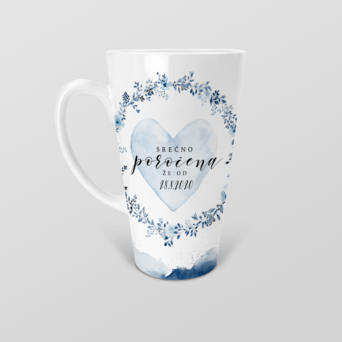 Čudovita skodelica z napisom Srečno poročena modre barve. Možnost poljubnega napisa in tudi barve – napišite željen tekst in barvo v okence. Lahko nas tudi kontaktirate glede dodatnih želja.