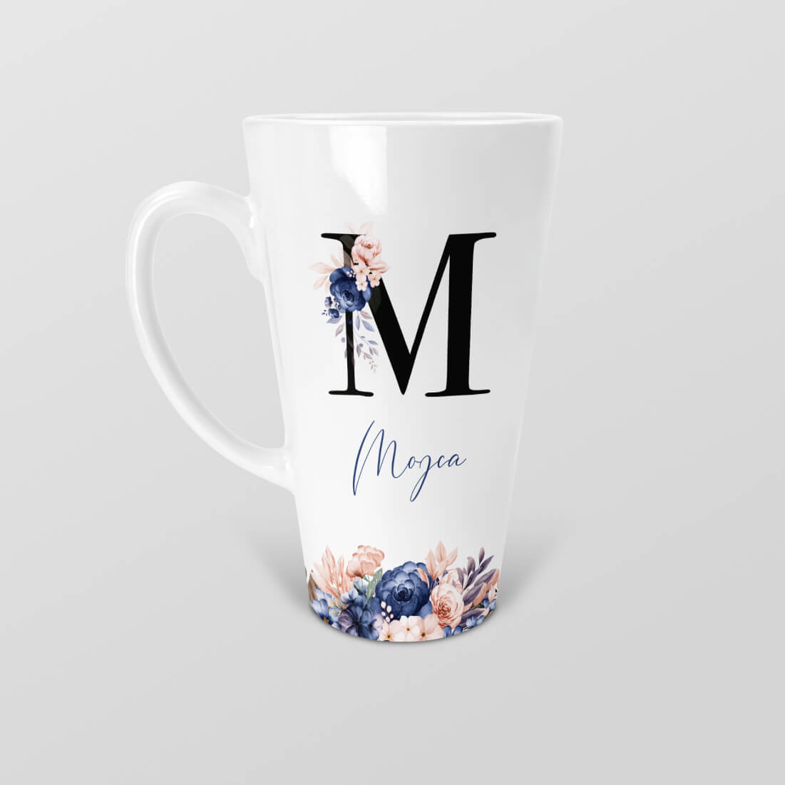 Personalizirana visoka skodelica z modrimi in mareličnimi cvetovi.